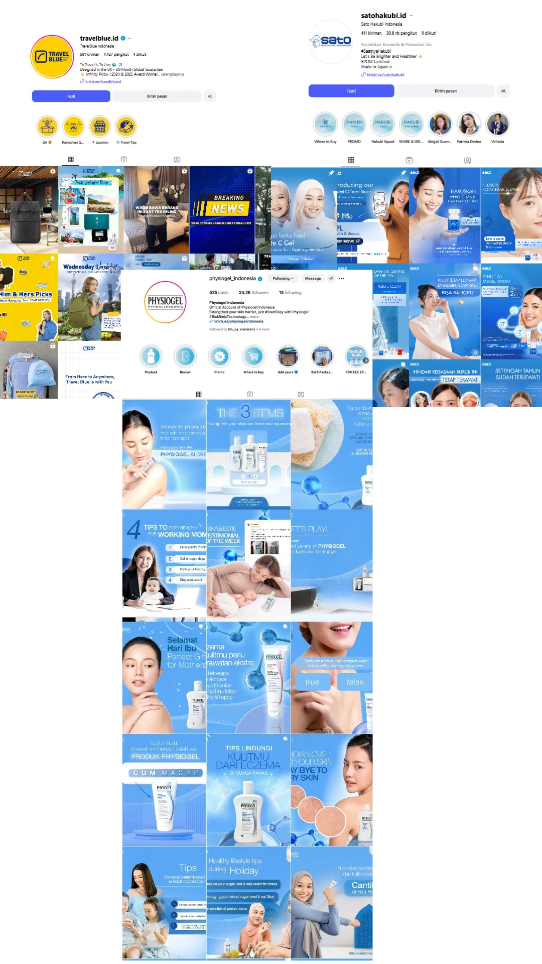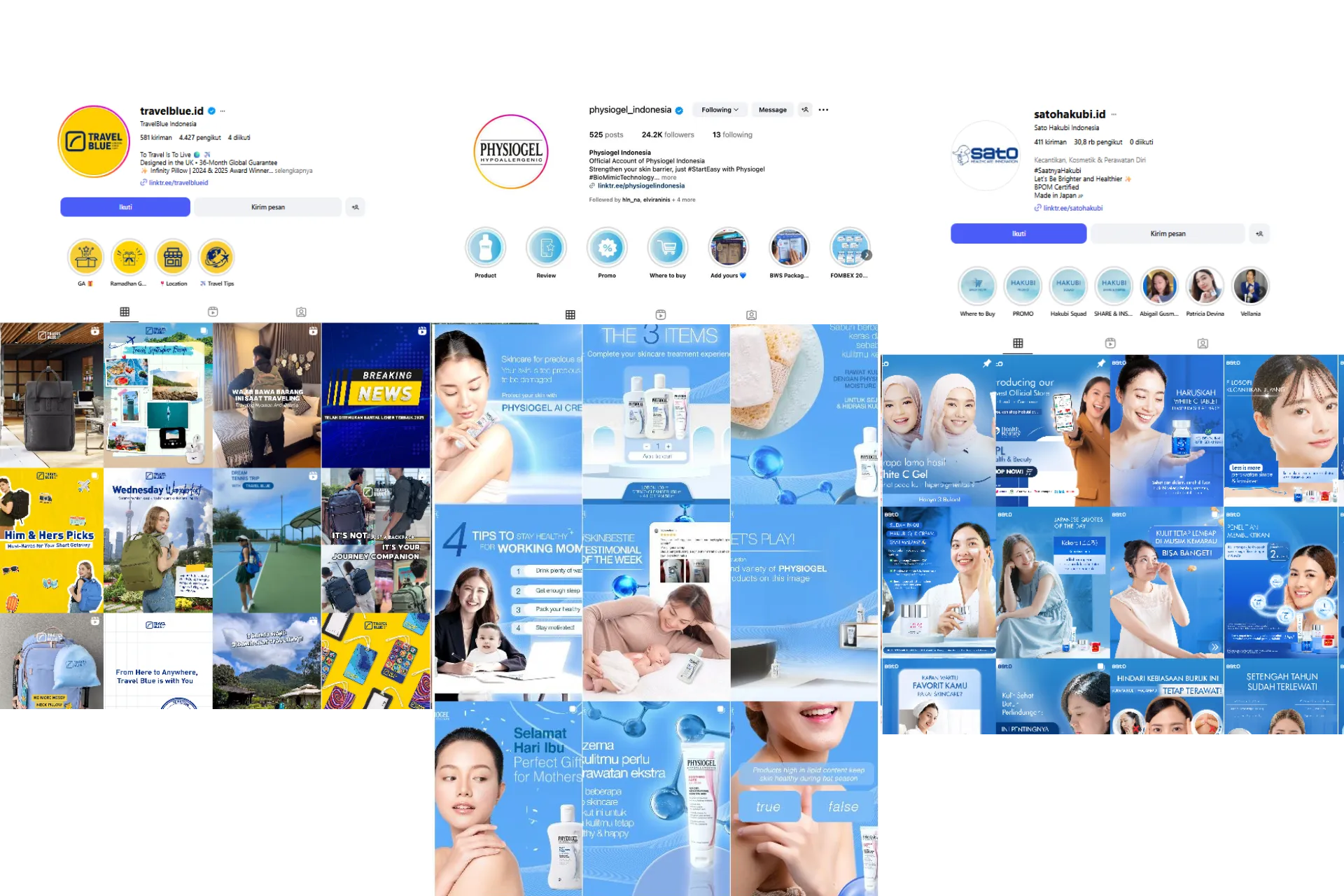 Physiogel and Sato Hakubi Indonesia are high-level skincare which are formulated in Europe and Japan. Both came from a high-end pharamaceutical company. We maintained their Instagram channel and managed to grew around 10K of new followers in one year time. Travel blue is a global brand that just entered Indonesian market. And we nurture their local presence from scratch.